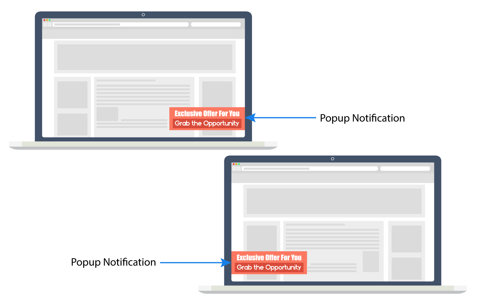 Notification popups slide in at the bottom of the webpage as per the specified interval after the user visited the webpage. This way user will get time to examine your webpage and only after that the popup will grab their attention.